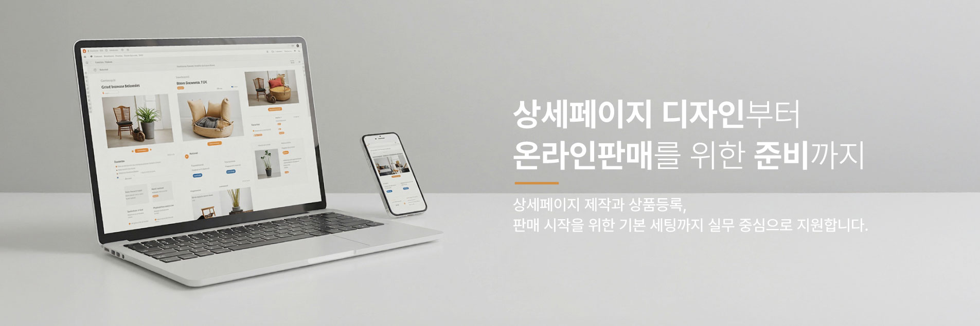 상세페이지 디자인을 중심으로 온라인 마켓 입점과 상품등록까지 판매 실무를 진행합니다.